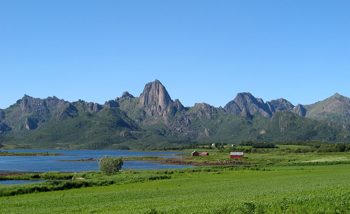 Il fait grand soleil, et c’est magnifique des fenêtres de la maison. Nous partons donc faire un grand tour de l’île de Langøya pour profiter au maximum des paysages sous ciel bleu. Direction le canton de Bø, que nous connaissons de nom grâce à la radio que nous écoutons dans la petite Swift : Radio Bø (à prononcer Beuuuuh), nom qu’ils répètent toutes les 10 minutes via un « Bø, radio Bø » que nous allons garder en mémoire et en slogan familial pendant des années… La route est belle, les couleurs somptueuses sous le ciel bleu.