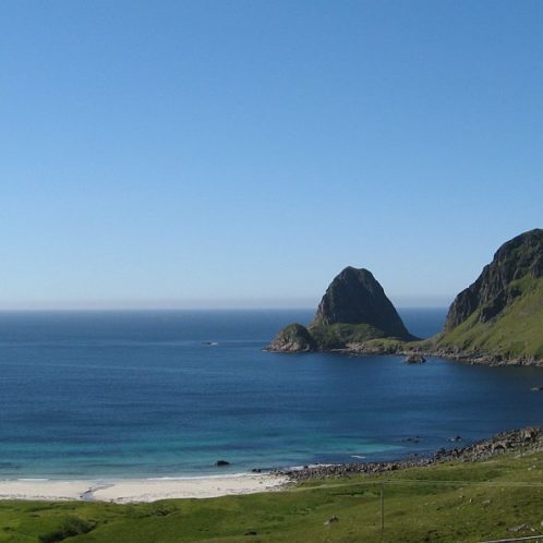 En route vers le petit port de Hovden, tout au Nord, nous faisons d’abord un long arrêt à la plage de Sandvika, juste magnifique. Sable blanc, eau cristalline et fonds turquoise, en face de pics plongeant dans la mer : on se croirait presque aux Caraïbes, mais avec des montagnes. Et surtout avec un petit vent frais revigorant, et une eau un peu froide (qui a dit glaciale ? en tous cas, les plus jeunes mouilleront le bas de leurs bermudas quand même). C’est vivifiant, et nous sommes quasi seuls dans cet endroit splendide.