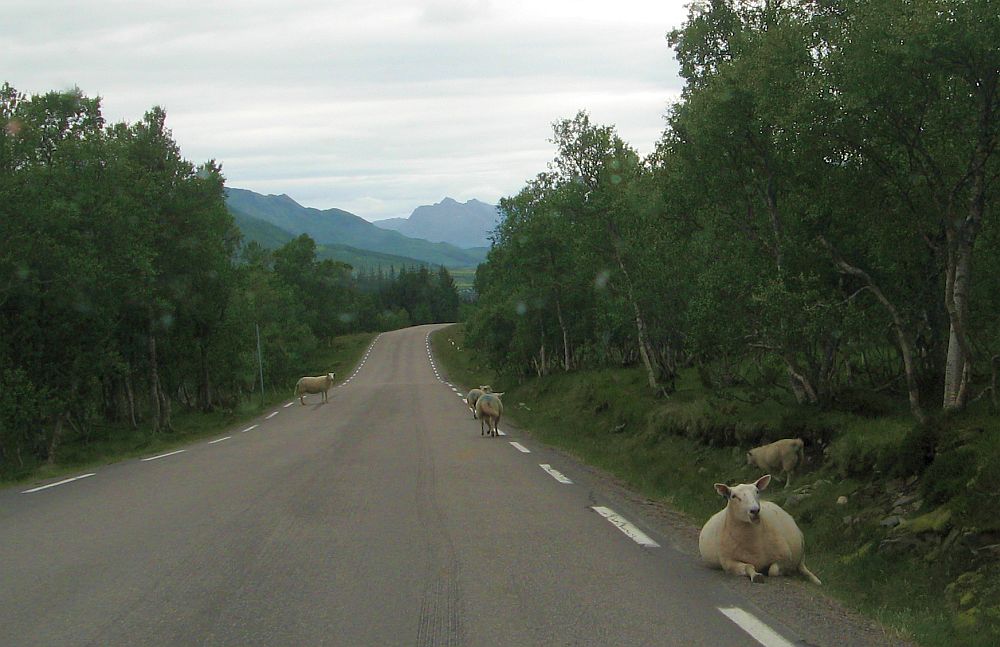 L’été, les moutons et les vaches sont en effet souvent en semi-liberté (en dehors des zones urbaines bien sûr). Vous verrez des passages à barres métalliques inscrustées dans les routes, signalés par des panneaux « ferist » : ce sont des passages qui empêchent les animaux de passer. On roule dessus sans soucis, il faut juste ralentir un peu. Ce système est utilisé aussi dans d’autres pays à travers le monde (vous en avez déjà vu en France ? ). Mais en Norvège, en tous cas, il y en a beaucoup.