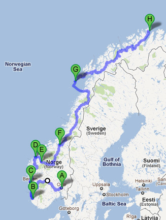 J’ai fait un peu ce genre d’itinéraire dans mon récit de 1989, en 4 semaines, mais nous étions montés jusqu’au Cap Nord et nous avions pris un peu de temps en Laponie. Donc en faisant demi-tour vers Tromsø, pourquoi pas en 3 semaines, surtout en allant jusqu’à Bergen au lieu de Kristiansand depuis le Danemark.